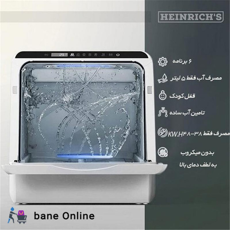 ظرفشویی هنریش هم به آب شهری وصل میشود هم برای مواقع ضروری 5 لیتر مخزن آب دارد که میتوان بدون وصل کردن به شیر آب استفاده شود. دستگاه برای ضدعفونی و استریل استفاده میشود. دستگاه 6 پروگرام دارد شامل - شستشو استاندارد و سخت 69 دقیقه - شستشو سریع و آسان 29 دقیقه